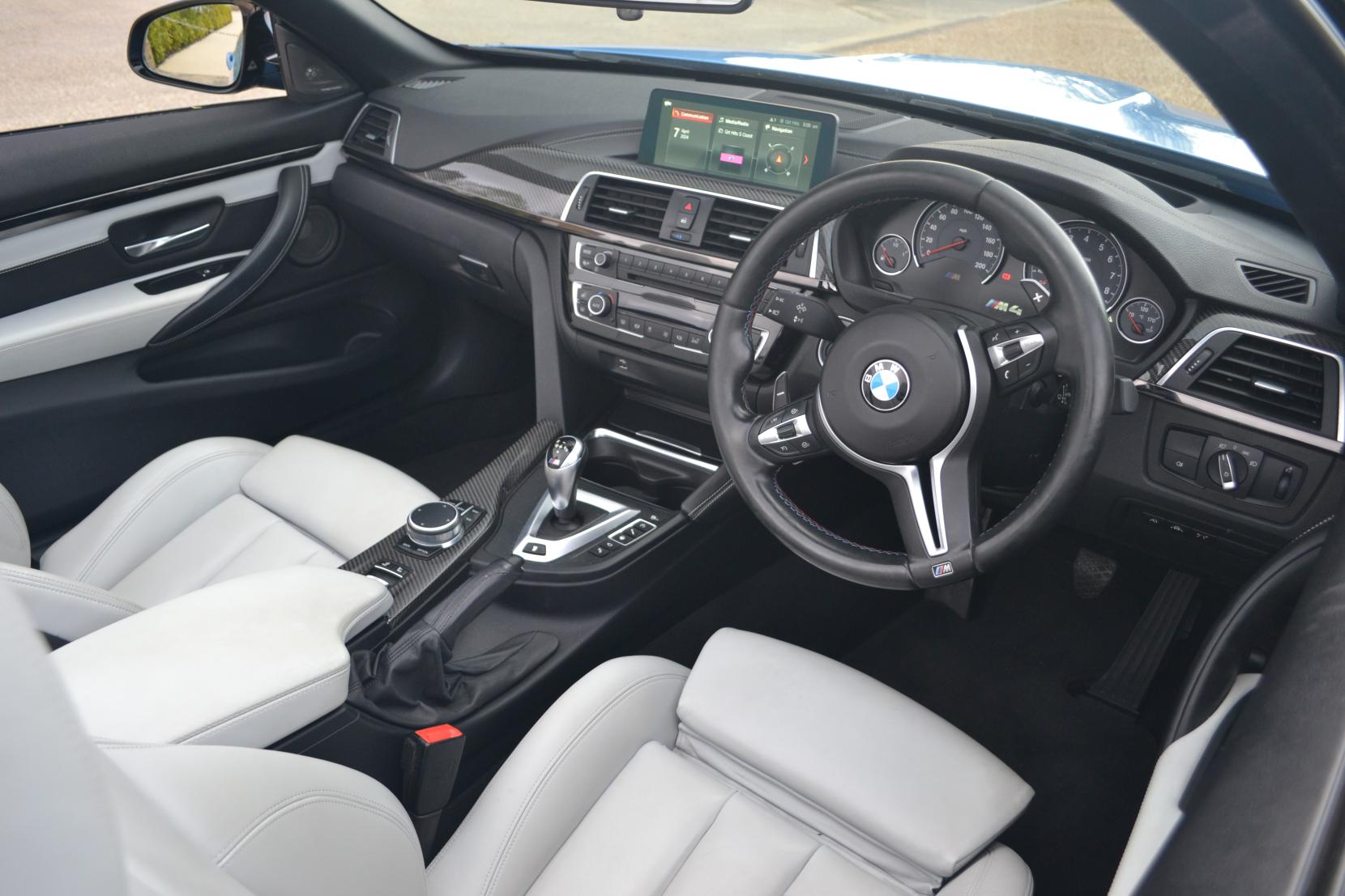 Under the hood, you'll find a powerful 3.0-litre petrol engine that delivers a staggering 444 bhp and 406 lbs/ft of torque. With a lightning-fast acceleration of 4.3 seconds and a top speed of 155 mph, this BMW M4 is a true performance machine. And with a fuel consumption of 32.5 mpg, it combines power with efficiency.